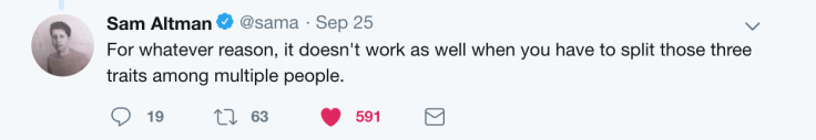 The final tweet in this thread, however, broke my heart. I was always under the impression that one of the major keystones to starting a business is to have the right co-founder. Someone who is the Ying to your Yang. Someone who compliments your skills and shares your values. Someone whose strengths are your weaknesses. I was under the impression that if you are the visionary, then you need someone who can make detailed plans and help you execute. And if you’re a detail-oriented planner and executor, then you need to find a visionary who you can work with.